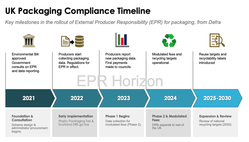 EPR has been phased in since 2021, expanding each year to include more materials, higher reporting accuracy, and modulated fees for recyclability.